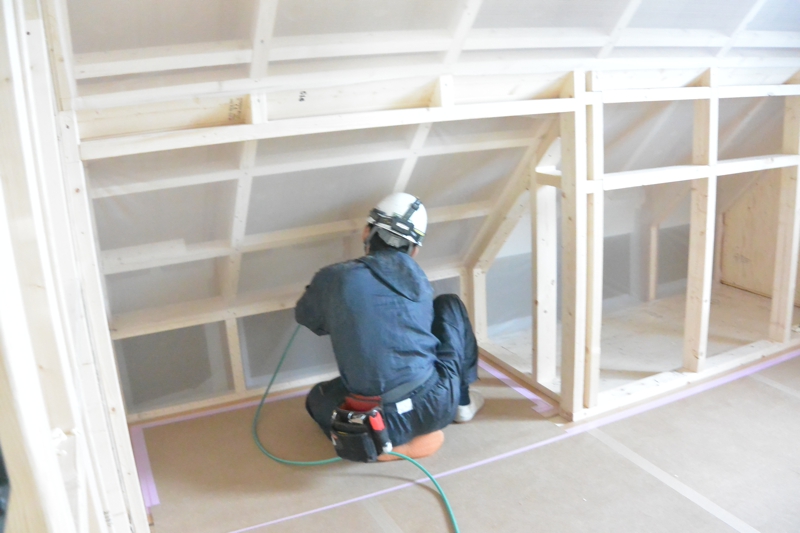 1階天井には、防湿シートが張られ、グラスウールの断熱材がぎっしりつまっておりました。