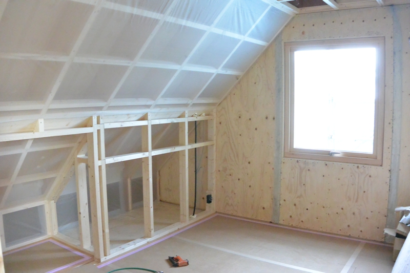 前回から変化したのはまずは壁に壁材用の下地の板が張られておりました。