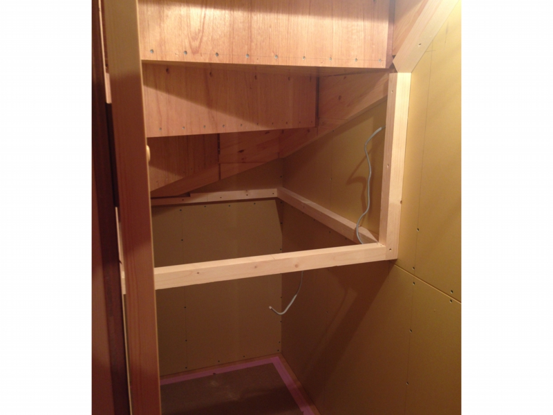 階段下の収納部分なんですが、階段の裏側が見えるまんまで良かったのですが、気を使っていただきクロスを張ろうってことになり、そうすると実は写真のように化粧壁を作るそうで、そうするとただえさえ狭い階段下がさらに狭くなってしまいます。